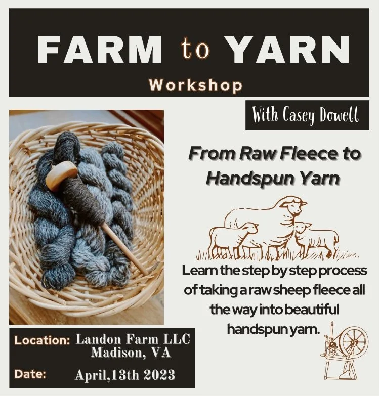 I will be teaching the step-by-step process of turning raw wool into beautiful yarn. The class will be held at Landon Farm in beautiful Madison County, Virginia. All materials are included. Please bring a bag lunch or grab a snack or sandwhich from the farm store, located onsite.